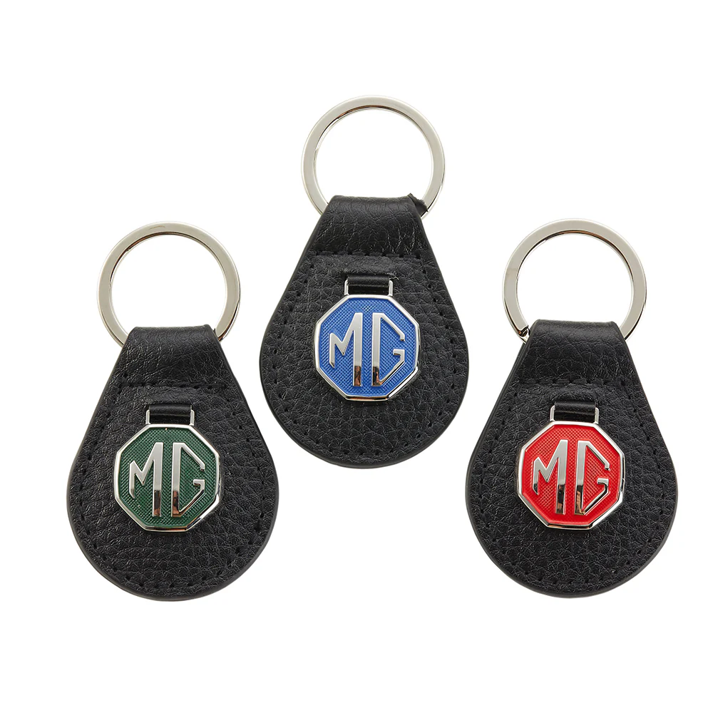 Stylish MG Keyring with the classic MG Badge mounted on to a leather tear drop key fob.